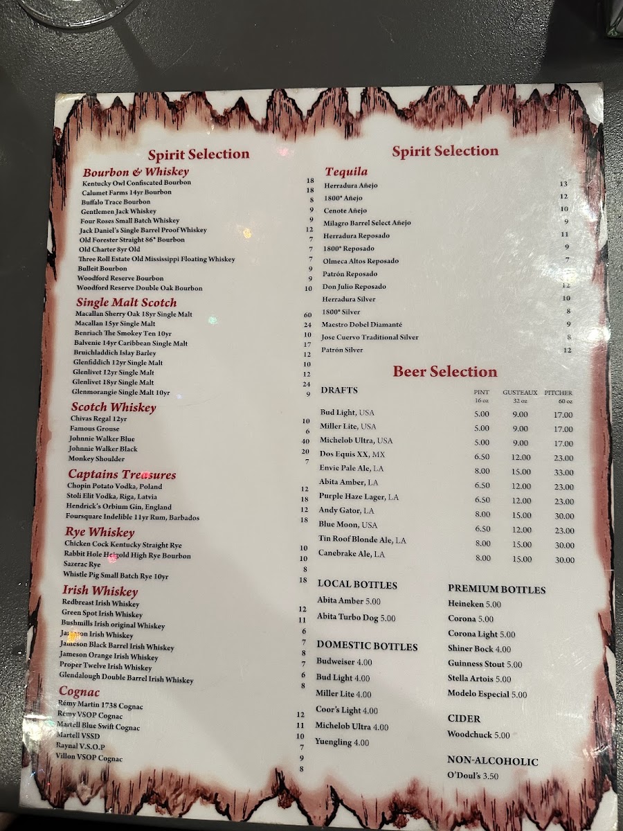 Crabmeat au gratin, black drum fillet, Mike's special, shrimp supreme, stuffed crab, oyster Bienville, stuffed shrimp, shrimp stuffed bell pepper, and crabmeat stuffed mushroom.